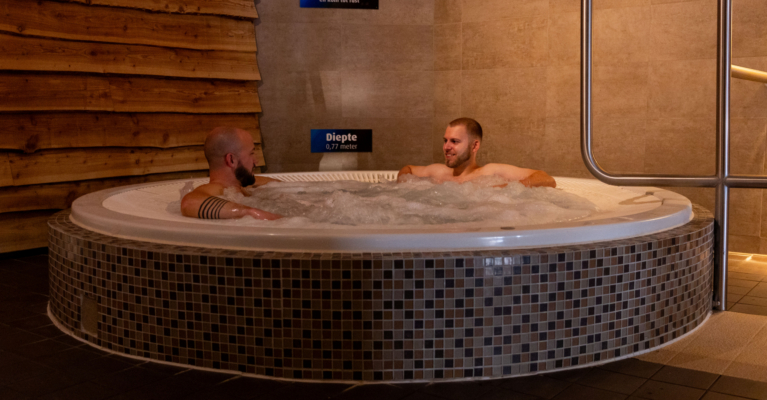 Kom tot rust tussen je saunagangen door. De whirlpool is gevuld met warm water en omringd door zachte bubbels.
